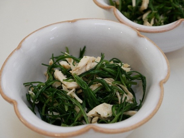 今回紹介するのはおかひじきの辛し和えです。以前は道の駅やアンテナショップでしか見かけませんでしたが、最近ではスーパーでも購入できるようになってきました。シャキシャキとした食感が特徴で鉄分も多く含まれ鶏ささみなどのたんぱく質が多い食材と合わせることで貧血予防の効果も期待できます。旬も4~7月とまさに今の時期にぴったりのレシピです。ぜひお試しください。