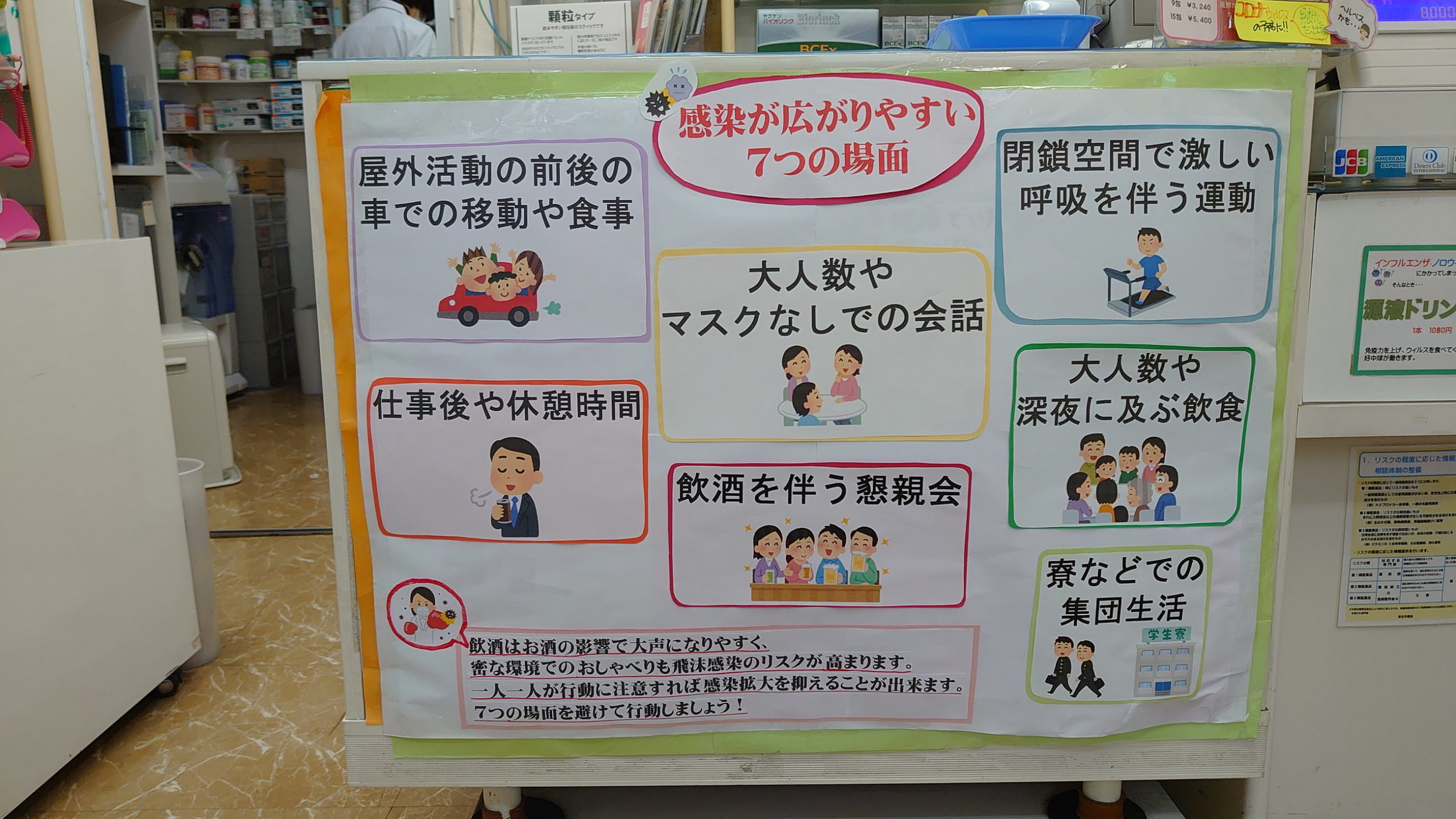下図のポップは、サニー薬局の店頭でも「感染注意7つの場面」のポップを貼付して、より一層の感染予防を呼びかけております。